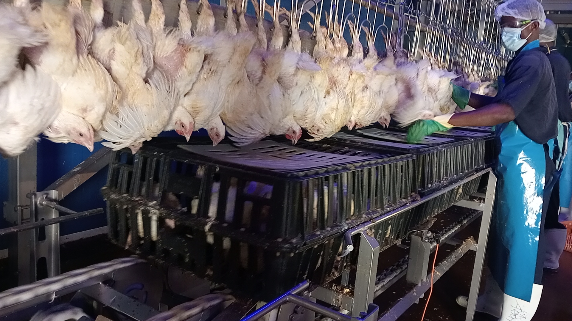 Katika kichinjio cha Kenchic cha Halal, kituo cha uchinjaji ni ya kiotomatiki chenye mwangaza wa buluu unaotuliza kuku na kupunguza msongo wa mawazo.